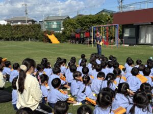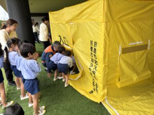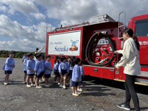 今日は幼稚園に消防車が来て、みんなで避難訓練をしました。